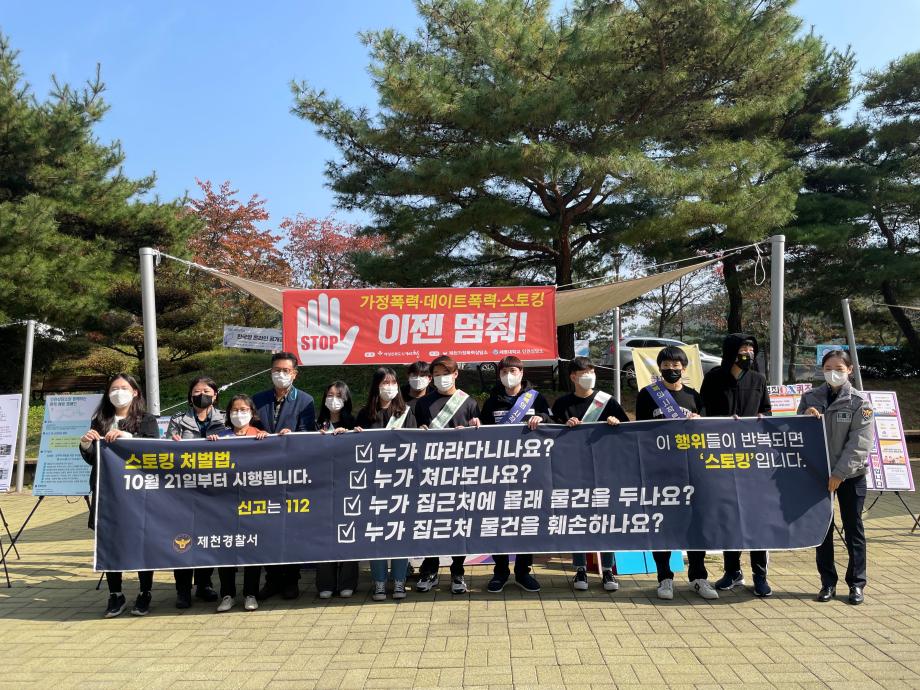 본문 시작 홈으로 커뮤니티 학과안내 교수소개 학과과정 커뮤니티 홈페이지가이드 학과사진첩 공지사항 취업정보 학과사진첩 학과행사 동아리 학생회 교우소식 학과사진첩 페이스북 트위터 프린트 PALETTE 데이트폭력과 스토킹행위 근절을 위한 캠페인 진행 법학과 3782 2021-10-26 세명대학교 법학과(학과장 장성원) 봉사동아리 PALETTE는 2021년 10월 26일(화) 교내 학생회관 앞에서 스토킹처벌법 시행을 맞아 데이트폭력과 스토킹행위 근절을 위한 캠페인을 진행하였다. 이 캠페인에는 세명대학교 인권서포터즈 ‘SMile’과 제천가정폭력상담소, 제천경찰서가 함께 참여하였다. 목록 이전HAN'S 심리상담센터와 상호 교류・협력 협약(MOU) 체결 다음 2021.11.02 경찰 공무원 특강 담당부서 : 법학과 담당자 : - 연락처 : 043-649-1764 최종수정일 : 2024-10-26 만족도조사 만족도 조사 이 페이지에서 제공하는 정보에 대하여 만족하시나요? 매우만족 만족 보통 불만족 매우불만족