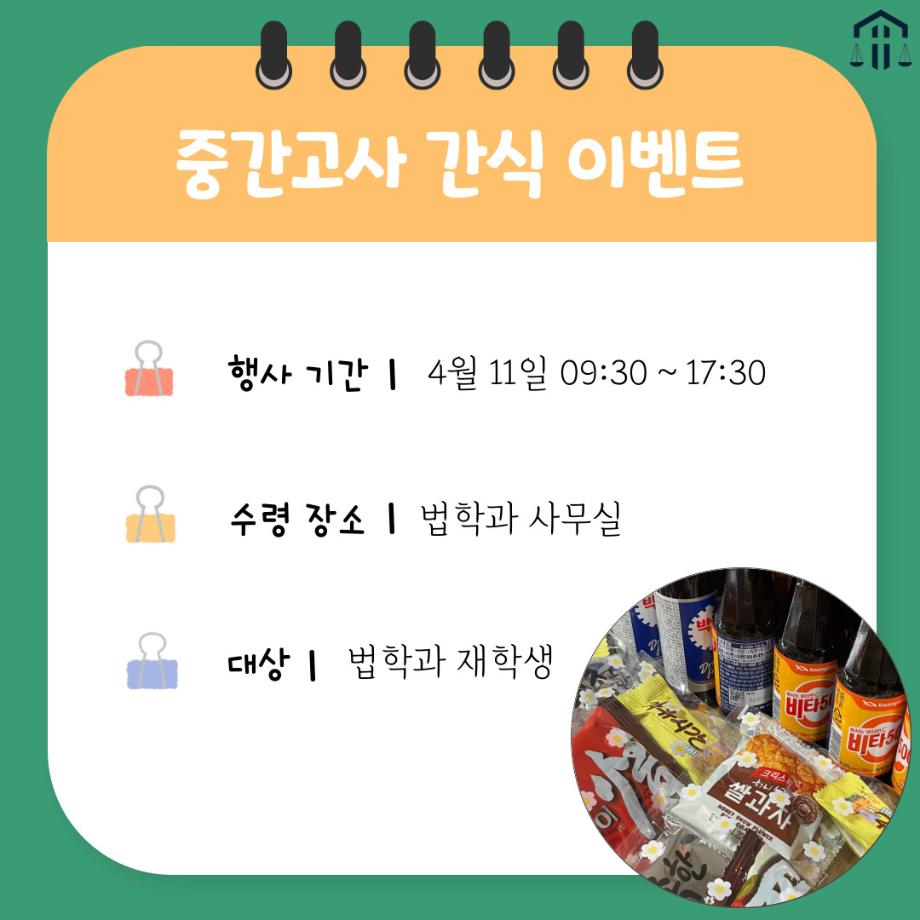 본문 시작 홈으로 커뮤니티 학과안내 교수소개 학과과정 커뮤니티 홈페이지가이드 학과사진첩 공지사항 취업정보 학과사진첩 학과행사 동아리 학생회 교우소식 학과사진첩 페이스북 트위터 프린트 🍫법학과 '하로'의 간식 이벤트🍫 법학과 5354 2023-04-11 🍫법학과 '하로'의 간식 이벤트🍫 🔔EVENT🔔 시험이 얼마 남지 않아서 힘들죠? 🤔 하로가 중간고사 기간 중 법학과 학생분들을 위해 '간식꾸러미'를 준비했어요! :) 소소하지만, 당충전하고 모두 힘내봅시다👍 ✔ 재고 소진 시까지 😆 ✔ 선착순 4월 11일 (화) 09:30~17:30 ✔ 1인 간식꾸러미1개, 음료수1개 세트‼ ✔ 학과 사무실로 오셔서 받아가시면 됩니다👏 목록 이전[법학과 축구동아리 DIKE] 이길 수 있었는데...(중간고사 걱정은 나중에..축구가 먼저다) 다음 [벚꽃세봄] 뿅망치에 줄어든 내 키를 돌리도... 담당부서 : 법학과 담당자 : - 연락처 : 043-649-1764 최종수정일 : 2024-10-26 만족도조사 만족도 조사 이 페이지에서 제공하는 정보에 대하여 만족하시나요? 매우만족 만족 보통 불만족 매우불만족