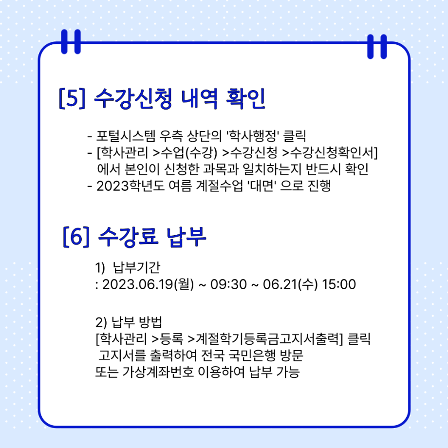 - 기타 수강신청 관련 사항은 정규학기 수강신청 안내 및 홈페이지 수강 관련 사항을 적용함