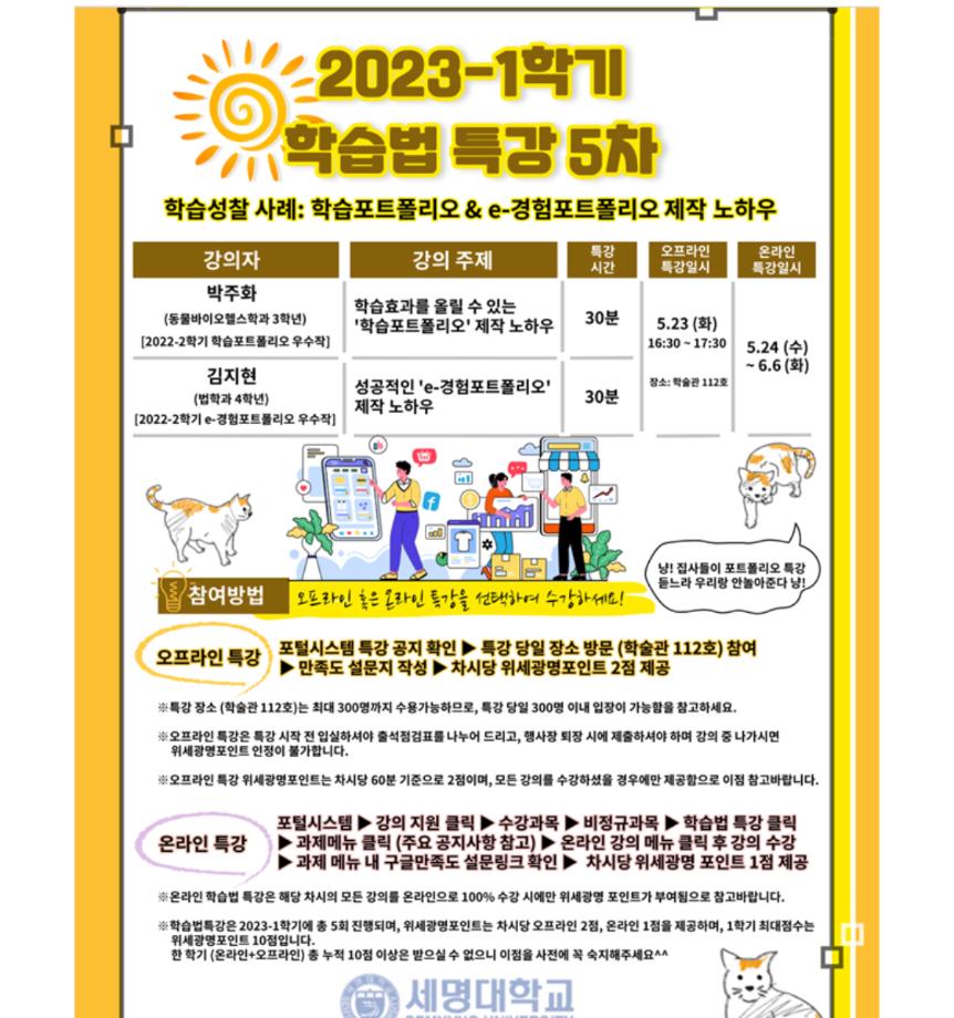본문 시작 홈으로 커뮤니티 학과안내 교수소개 학과과정 커뮤니티 홈페이지가이드 학과사진첩 공지사항 취업정보 학과사진첩 학과행사 동아리 학생회 교우소식 학과사진첩 페이스북 트위터 프린트 김지현(20학번) - 교내 학습포트폴리오 제작 노하우 특강 (23.05.23) 법학과 7577 2023-06-20 지난 5월 23일 20학번 김지현 학우가 학습포토폴리오 & e-경험포트폴리오 제작 노하우를 주제로 교내에서 특강을 진행하였습니다!! 목록 이전Law Angel, 보호관찰소와 멘토링 결연 및 보호관찰위원 위촉 다음 2023-07-13(목) 세명고등학교 박람회 담당부서 : 법학과 담당자 : - 연락처 : 043-649-1764 최종수정일 : 2024-10-26 만족도조사 만족도 조사 이 페이지에서 제공하는 정보에 대하여 만족하시나요? 매우만족 만족 보통 불만족 매우불만족