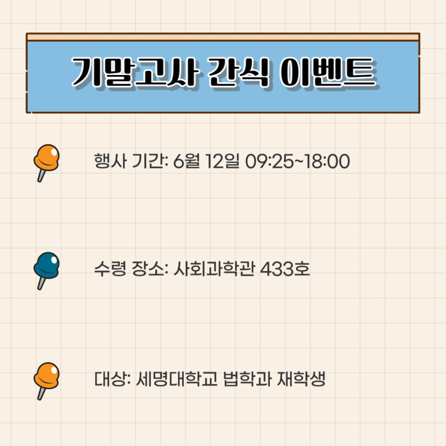 본문 시작 홈으로 커뮤니티 학과안내 교수소개 학과과정 커뮤니티 홈페이지가이드 학과사진첩 공지사항 취업정보 학과사진첩 학과행사 동아리 학생회 교우소식 학과사진첩 페이스북 트위터 프린트 법학과 간식 이벤트🍪 법학과 1582 2025-06-12 법학과 학생회 "다온" 에서 시험으로 지친 학생들을 위해 간식이벤트를 준비했습니다:) 목록 이전2025학년도 법학과 학술캠프 다음 법학과 선배들의 진로 현황 담당부서 : 법학과 담당자 : - 연락처 : 043-649-1764 최종수정일 : 2024-10-26 만족도조사 만족도 조사 이 페이지에서 제공하는 정보에 대하여 만족하시나요? 매우만족 만족 보통 불만족 매우불만족