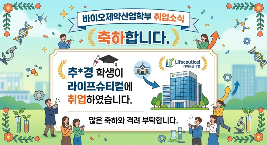 본문 시작 홈으로 학부자료실 학부소개 교육과정 학부공지게시판 학부자료실 홈페이지가이드 학부행사 및 사진게시판 학부행사 및 사진게시판 학생회 소개 학부행사 및 사진게시판 페이스북 트위터 프린트 축하합니다. 추*경 학생이 라이프 슈티컬에 취업하였습니다. 바이오제약산업학부 34 2026-04-27 축하합니다. 추*경 학생이 라이프 슈티컬에 취업하였습니다. 목록 이전GC-MS 기기 활용 활동 다음 축하합니다. 이*서 학생이 시마즈사이언티픽코리아에 취업하였습니다. 담당부서 : 바이오제약산업학부 담당자 : - 연락처 : 043-649-1729 최종수정일 : 2024-10-26 만족도조사 만족도 조사 이 페이지에서 제공하는 정보에 대하여 만족하시나요? 매우만족 만족 보통 불만족 매우불만족