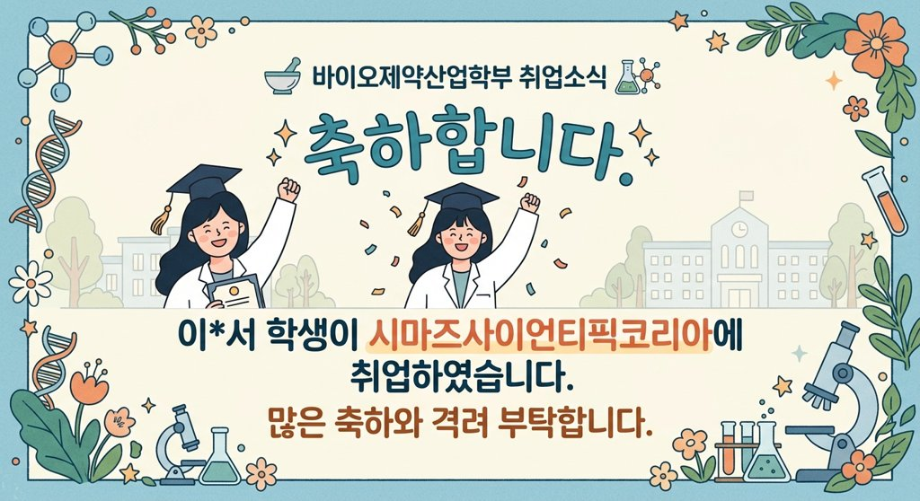 본문 시작 홈으로 학부자료실 학부소개 교육과정 학부공지게시판 학부자료실 홈페이지가이드 학부행사 및 사진게시판 학부행사 및 사진게시판 학생회 소개 학부행사 및 사진게시판 페이스북 트위터 프린트 축하합니다. 이*서 학생이 시마즈사이언티픽코리아에 취업하였습니다. 바이오제약산업학부 35 2026-04-27 축하합니다. 이*서 학생이 시마즈사이언티픽코리아에 취업하였습니다. 목록 이전축하합니다. 추*경 학생이 라이프 슈티컬에 취업하였습니다. 다음 2026 자기설계 해외배낭연수 설명회 시행 안내 담당부서 : 바이오제약산업학부 담당자 : - 연락처 : 043-649-1729 최종수정일 : 2024-10-26 만족도조사 만족도 조사 이 페이지에서 제공하는 정보에 대하여 만족하시나요? 매우만족 만족 보통 불만족 매우불만족