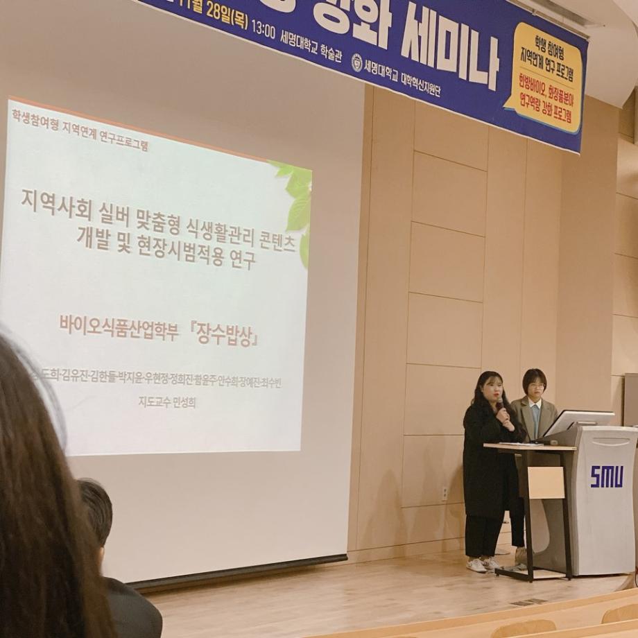 본문 시작 홈으로 커뮤니티 학부소개 진로·취업 교육과정 커뮤니티 대학원 입학상담 홈페이지가이드 갤러리 공지사항 문의게시판 학생회 전공동아리 동문회 갤러리 전공자료실 Youtube Instagram Facebook Blog 갤러리 페이스북 트위터 프린트 학생참여형 지역연계 연구 최종 발표 및 장려상 수상 바이오식품산업학부 5909 2019-12-02 2019년 11월 28일 (목) 학생참여형 지역연계연구 최종 발표회가 있었습니다. 우리 학부에서 참여한 '장수밥상'팀에서는 오후 1시30분부터 3시30분까지 학술관 로비에서 포스터 발표를 하였고 3시30분 부터는 학술관 102호에서 연구성과 제발표(발표자 3학년 우현정)를 하였고 장려상을 수상하였습니다 목록 이전학생경험중심 발표회 다음 [실험조리] 수강생 학부 발전기금 기부 담당부서 : 바이오식품산업학부 담당자 : - 연락처 : 043-649-1431 최종수정일 : 2024-10-26 만족도조사 만족도 조사 이 페이지에서 제공하는 정보에 대하여 만족하시나요? 매우만족 만족 보통 불만족 매우불만족