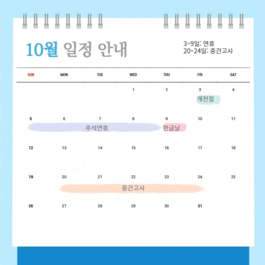 본문 시작 홈으로 커뮤니티 학과소개 입학정보 교과과정 커뮤니티 홈페이지가이드 포토갤러리 SNS 소통 공간 포토갤러리 공지사항 동아리 포토갤러리 페이스북 트위터 프린트 10월 다이어리 항공서비스학과 884 2025-10-06 안녕하십니까 세명대학교 항공서비스학과 온라인 홍보국 💙푸르미르💙입니다. 10월에는 추석연휴와 중간고사가 있습니다! 확인하시고 일정에 착오 없으시길 바라겠습니다 😊 즐거운 연휴 보내세요🙇♂️ 소중한 꿈을 품고 그 누구보다 높이 오를 여러분을 저희 "푸르미르" 가 항상 응원하겠습니다 ✈💙 궁금한 사항이 있으시다면 언제든지 SNS로 연락 주십시오 💬 #세명대학교 #항공서비스학과 #세명대 #항공과 #푸르미르 #다이어리 목록 다음 제주항공 에듀윙 Advanced class 다음 가을 맞이 일상 사진
