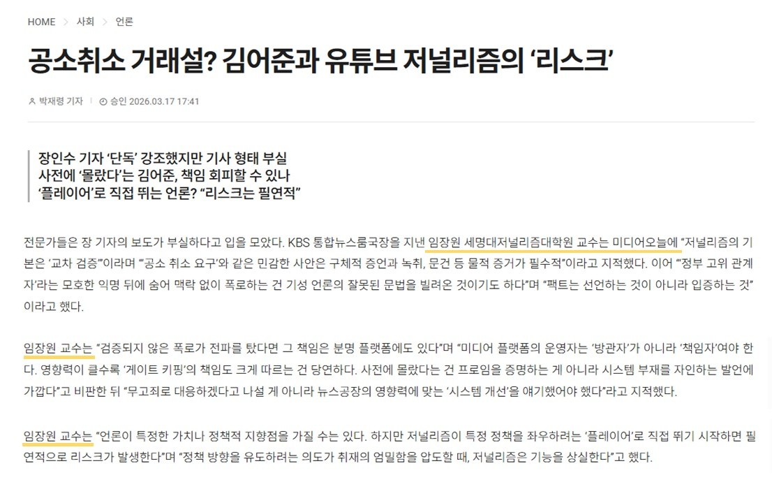 본문 시작 공지사항 대학원소개 교수/학생소개 교과과정 입학/학사안내 공지사항 게시판 저널리즘연구소 홈페이지가이드 언론보도 공지사항 언론보도 동영상 언론보도 페이스북 트위터 프린트 [미디어오늘] 임장원 교수 - 공소취소 거래설? 김어준과 유튜브 저널리즘의 ‘리스크’ 저널리즘대학원 조회 : 14 등록일 : 2026-03-18 기사 바로보기 목록 이전[미디어오늘] 정은령 교수 - 팩트체크 잘하는 기자들의 비결? “선량해도 처음부터 의심했다” 댓글수 0개 댓글이 없습니다. * 작성자 * 내용 댓글은 로그인 후에 이용해 주세요. 로그인
