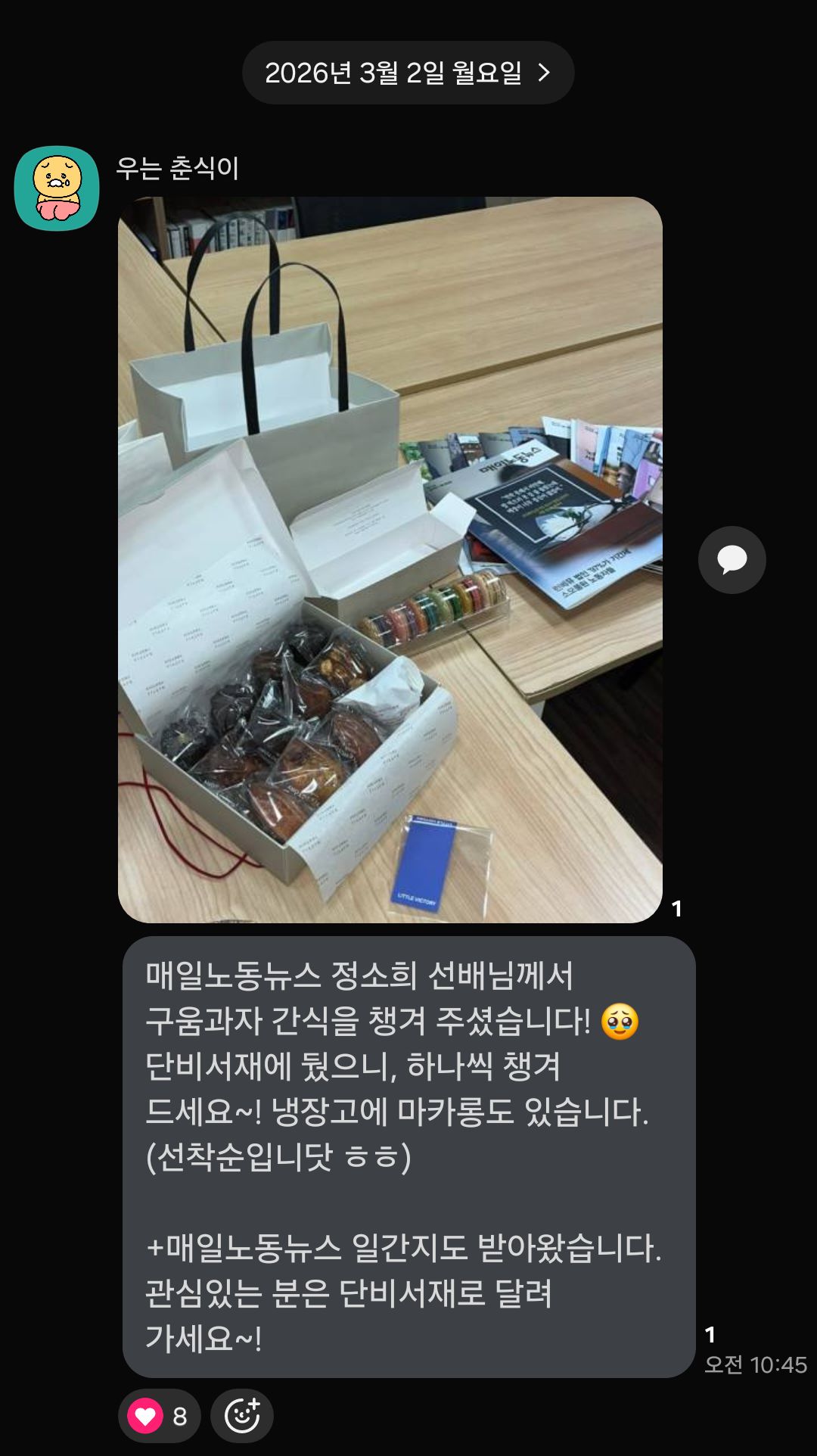 맛있는 구움과자와 마카롱, 그리고 매일노동뉴스 일간지까지 챙겨주셨습니다.