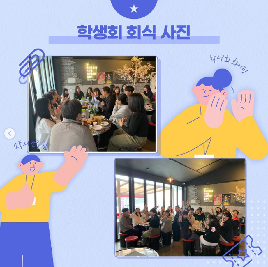 • COVID-19 이후 처음으로 학생회 전체 대면 만남이 이루어 졌다. 학생회장을 포함한 전체 학생회와 교수님들이 만나 학생회 활동 계획을 알리고 학생회 교류의 장을 마련하였다.