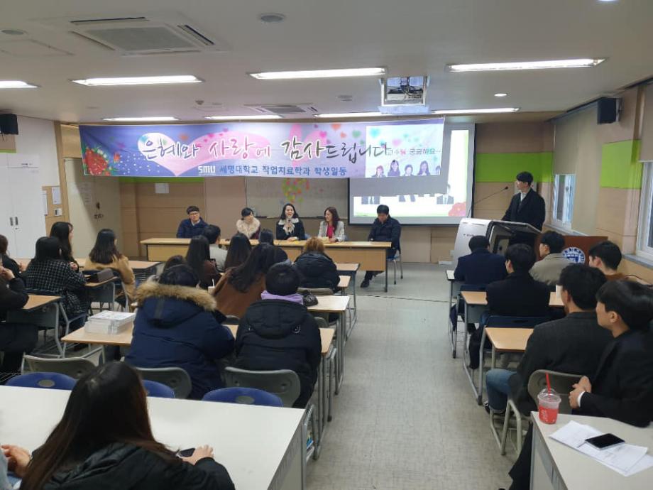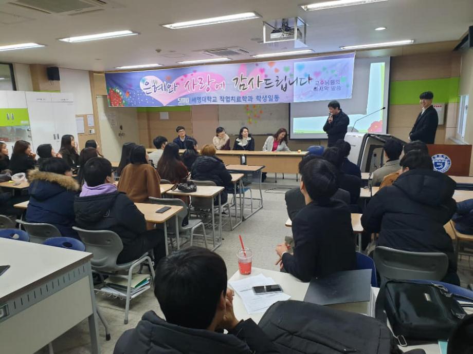 본문 시작 홈으로 커뮤니티 학과소개 진로 및 취업 학과과정 커뮤니티 SNS 홈페이지가이드 학과 소식 및 행사 학과공지 학과 소식 및 행사 대학생활 엿보기 어쩌다 출근 챌린지 학생회 동아리 통학버스 시간표 학과 소식 및 행사 페이스북 트위터 프린트 2018년도 사은회 작업치료학과 7084 2018-12-10 12월 10일, 작업치료사 국가시험을 보고 돌아온 4학년 학생들이 교수님들을 모시고 사은회를 진행하였습니다. 사은회는 과대표 학생의 편지 낭독, 그동안 교수님들께 궁금했던 질문들, 마지막으로 4학년 학생들에게 하고 싶은 교수님의 말씀 순으로 진행하였습니다. 4학년 학생들이 졸업하기 전 교수님들과 거리감 없이 함께 나눌 수 있는 좋은 시간이었습니다. 그동안 많은 가르침을 주신 스승의 은혜를 잊지 않겠습니다. 감사합니다. 목록 이전제46회 작업치료사 국가시험 다음 2018 임상실습 간담회 담당부서 : 작업치료학과 담당자 : - 연락처 : 043-649-1632 최종수정일 : 2024-10-26 만족도조사 만족도 조사 이 페이지에서 제공하는 정보에 대하여 만족하시나요? 매우만족 만족 보통 불만족 매우불만족