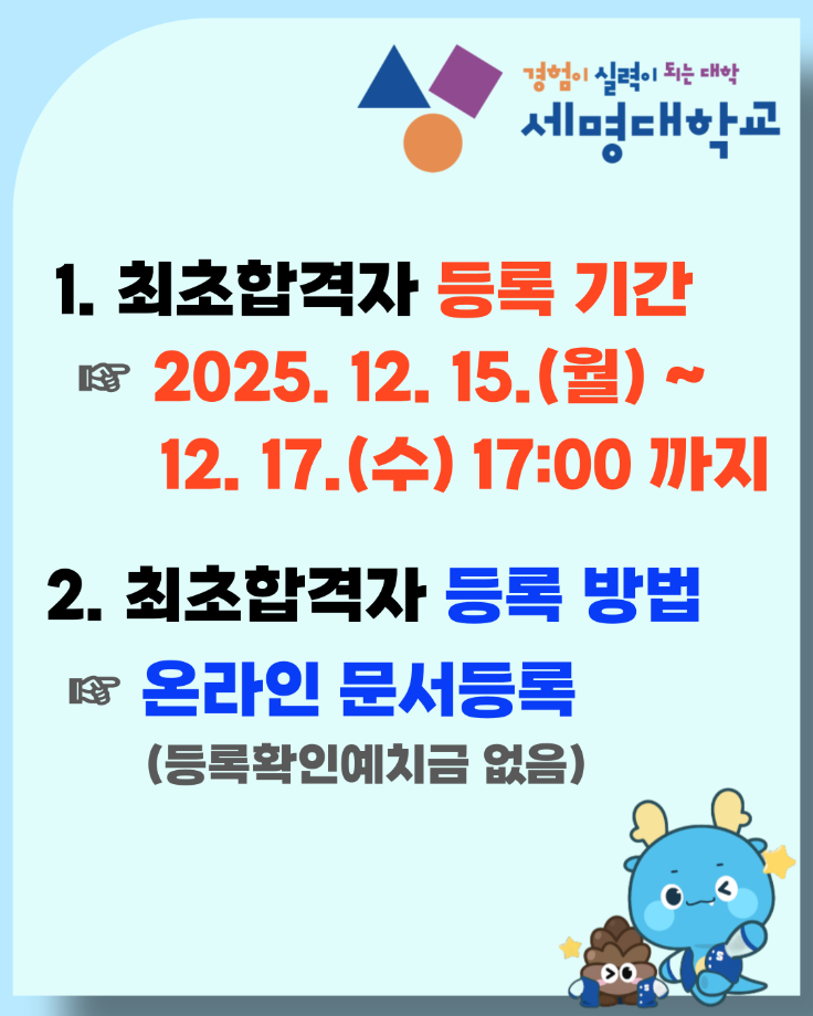 본문 시작 홈으로 학과생활 학과소개 교수소개 교과과정 학과생활 홈페이지가이드 사진게시판 공지사항 사진게시판 전공자료실 동아리 학과행사 사진게시판 페이스북 트위터 프린트 [수시모집] 2026학년도 수시모집 최초합격자 등록안내 산업디자인학과 79 2025-12-15 목록 이전[설경] 세명대학교 설경 다음 [수시모집] 2026학년도 수시모집 충원합격자 발표안내 담당부서 : 산업디자인학과 담당자 : - 연락처 : 043-649-1436 최종수정일 : 2024-10-26 만족도조사 만족도 조사 이 페이지에서 제공하는 정보에 대하여 만족하시나요? 매우만족 만족 보통 불만족 매우불만족