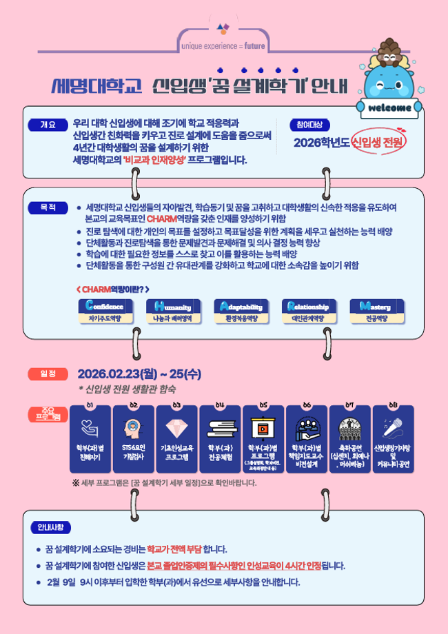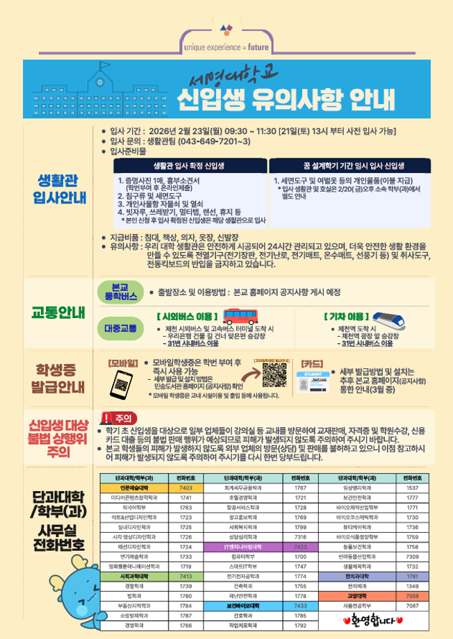 본문 시작 홈으로 학과생활 학과소개 교수소개 교과과정 학과생활 홈페이지가이드 사진게시판 공지사항 사진게시판 전공자료실 동아리 학과행사 사진게시판 페이스북 트위터 프린트 [학생처] 2026학년도 신입생 '꿈 설계학기(오리엔테이션)' 시행 산업디자인학과 30 2026-02-04 목록 이전다이소 세명대점 오픈(2/19) 안내 담당부서 : 산업디자인학과 담당자 : - 연락처 : 043-649-1436 최종수정일 : 2024-10-26 만족도조사 만족도 조사 이 페이지에서 제공하는 정보에 대하여 만족하시나요? 매우만족 만족 보통 불만족 매우불만족