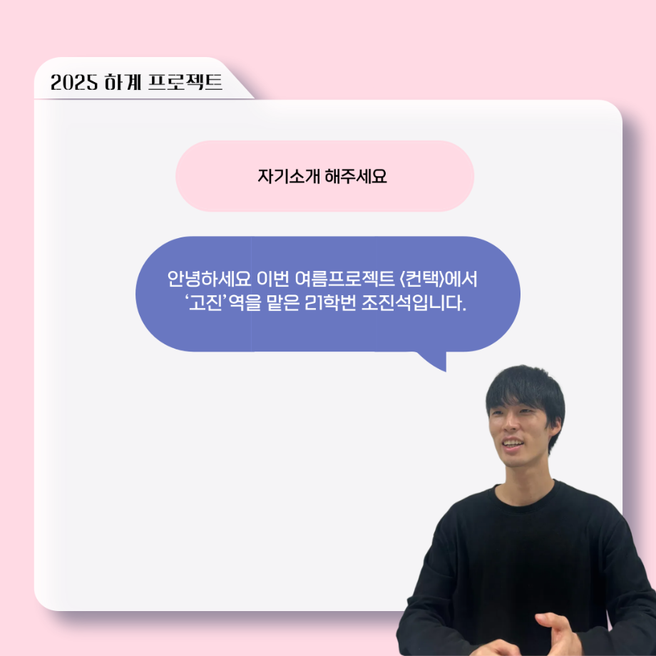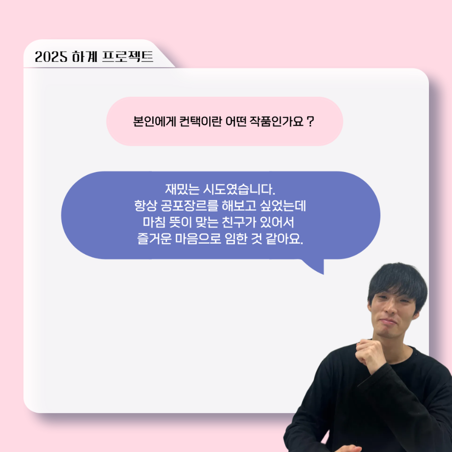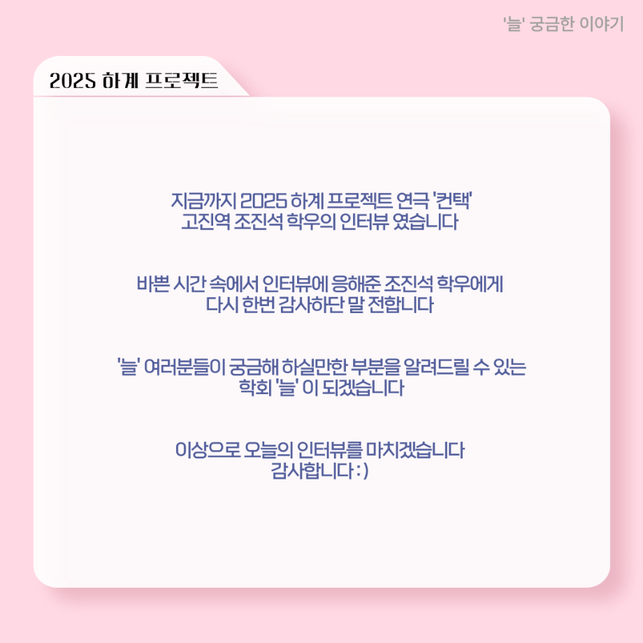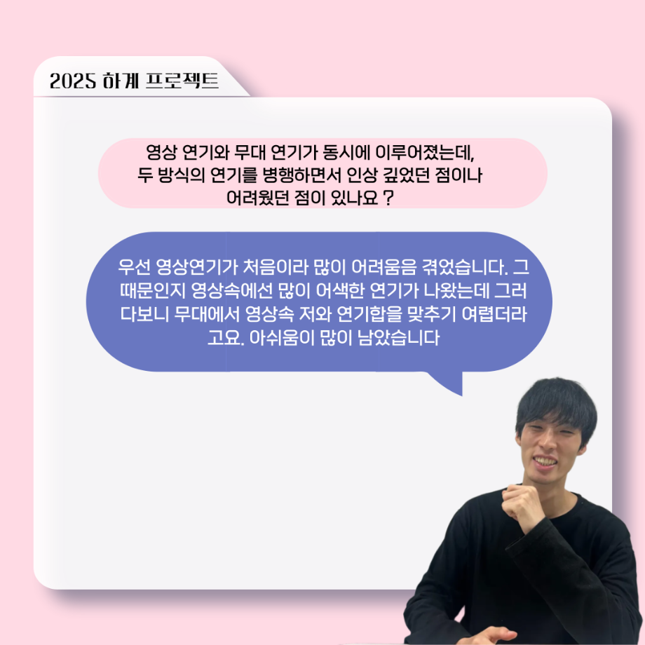본문 시작 홈으로 커뮤니티 학과소개 입학정보 교수소개 학과과정 커뮤니티 공연예매 안내 홈페이지가이드 포토갤러리 공지사항 포토갤러리 작품DB 동아리 학사일정 학생회 포토갤러리 페이스북 트위터 프린트 ‘늘‘ 궁금한 이야기 - 하계 프로젝트 ‘컨택’팀 고진役 < 조진석 > 연기예술학과 1345 2025-10-31 . 목록 이전‘늘‘ 궁금한 이야기 - 현장실습 < 신하연 > 다음 세명대학교 연기예술학과 과체전 담당부서 : 연기예술학과 담당자 : - 연락처 : 043-649-1733 최종수정일 : 2024-10-26 만족도조사 만족도 조사 이 페이지에서 제공하는 정보에 대하여 만족하시나요? 매우만족 만족 보통 불만족 매우불만족