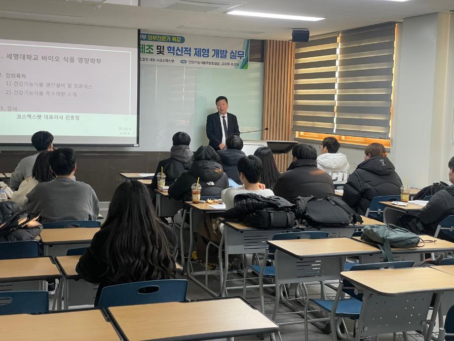 본문 시작 홈으로 커뮤니티 학부소개 진로·취업 교육과정 커뮤니티 대학원 입학상담 홈페이지가이드 갤러리 공지사항 갤러리 학생회 동문회 전공자료실 전공동아리 Youtube Instagram 갤러리 페이스북 트위터 프린트 실무체험 외부전문가 특강: 진호정 대표(코스맥스펫) 바이오식품영양학부 136 2025-12-04 실무체험교과목 "건강기능식품개발및실습" 특강 1) 강사: 진호정 대표(코스맥스펫) 2) 주제: '산업 현장에서의 건강기능식품 제조 및 혁신적 제형 개발 실무' 3) 일시 및 장소: 12월 3일, 바이오학관302호 *특강을 통해 현장 실무과 취업 및 연구동향에 대해 자세히 강의해 주신 진호정 대표님께 감사드립니다. 목록 이전2025 자기설계 해외배낭연수(7/8~7/15, 호주) 담당부서 : 바이오식품영양학부 담당자 : - 연락처 : 043-649-1578 최종수정일 : 2024-10-26 만족도조사 만족도 조사 이 페이지에서 제공하는 정보에 대하여 만족하시나요? 매우만족 만족 보통 불만족 매우불만족