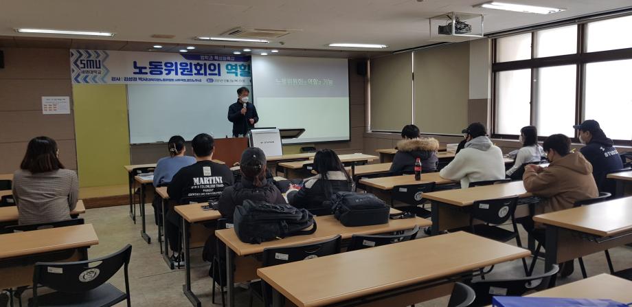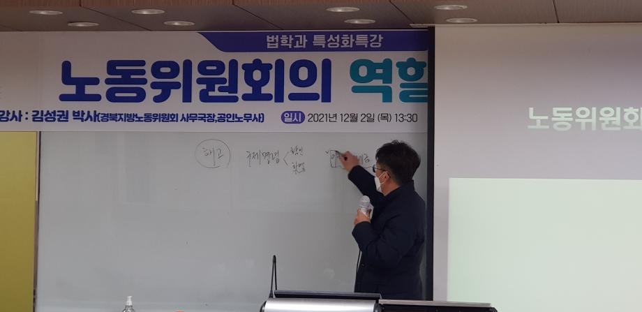 본문 시작 홈으로 학과과정 학과안내 교수소개 학과과정 커뮤니티 홈페이지가이드 비교과프로그램 교육과정 전공교육 체계도 대학원 법학과 비교과프로그램 학사일정 기업법무 지원프로그램 공공법무 지원프로그램 기업법무 지원프로그램 기업법무 지원프로그램 페이스북 트위터 프린트 2021. 12. 2. 노무사 특강 법학과 2979 2021-12-02 2021년 12월 2일 경북지방노동위원회 사무국장을 맡고 계시는 김성권 노무사님을 모시고 ' 노동위원회의 역할과 기능' 이라는 주제로 특강을 진행하였습니다. ※본 특강은 코로나19 방역 수칙을 준수하여 진행하였습니다.※ 목록 다음 2021 12. 3. 신변보호사 자격증(2차) 이전2021. 11. 26. 신변보호사 자격증(1차) 담당부서 : 법학과 담당자 : - 연락처 : 043-649-1764 최종수정일 : 2024-10-26 만족도조사 만족도 조사 이 페이지에서 제공하는 정보에 대하여 만족하시나요? 매우만족 만족 보통 불만족 매우불만족