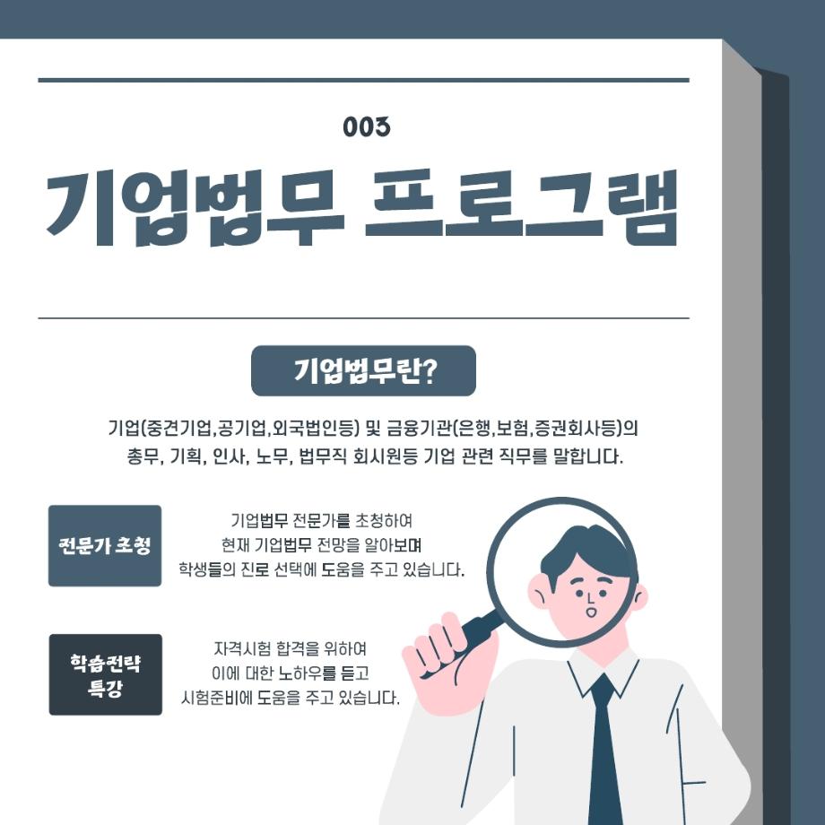 본문 시작 홈으로 학과과정 학과안내 교수소개 학과과정 커뮤니티 홈페이지가이드 비교과프로그램 교육과정 전공교육 체계도 대학원 법학과 비교과프로그램 학사일정 기업법무 지원프로그램 공공법무 지원프로그램 기업법무 지원프로그램 기업법무 지원프로그램 페이스북 트위터 프린트 비교과 프로그램 알아보기 '기업법무' 법학과 421 2025-09-04 목록 이전기업법무 지원프로그램이란??? 이전2025.05.21 항공운송법 관련 특강 담당부서 : 법학과 담당자 : - 연락처 : 043-649-1764 최종수정일 : 2024-10-26 만족도조사 만족도 조사 이 페이지에서 제공하는 정보에 대하여 만족하시나요? 매우만족 만족 보통 불만족 매우불만족