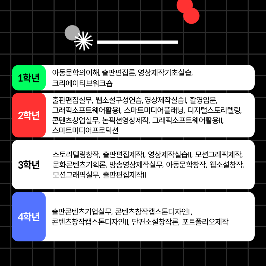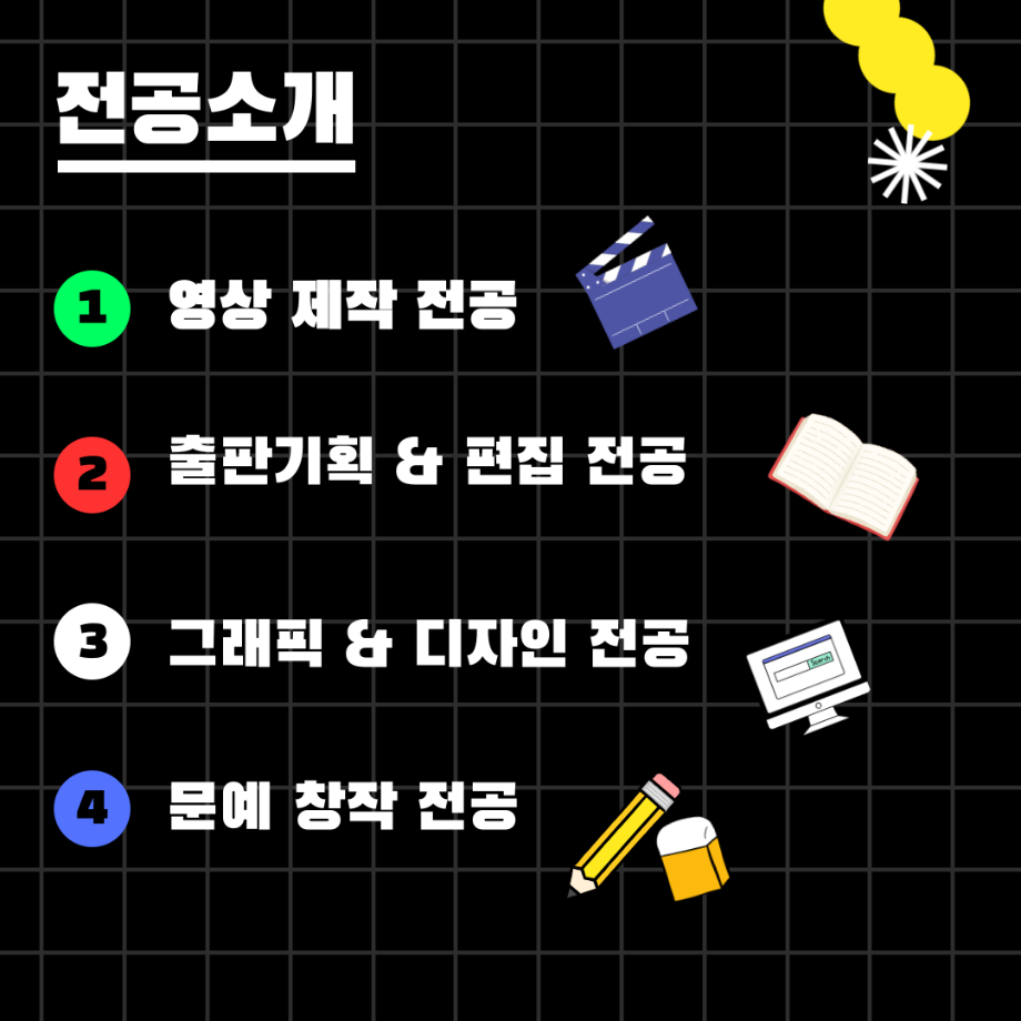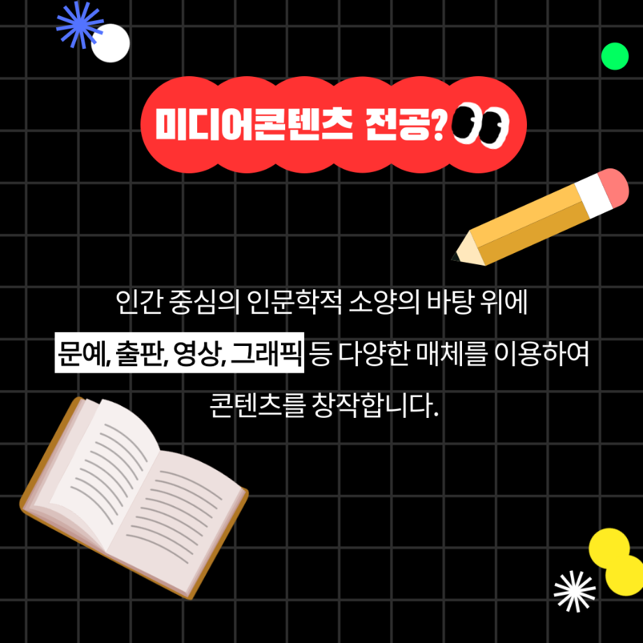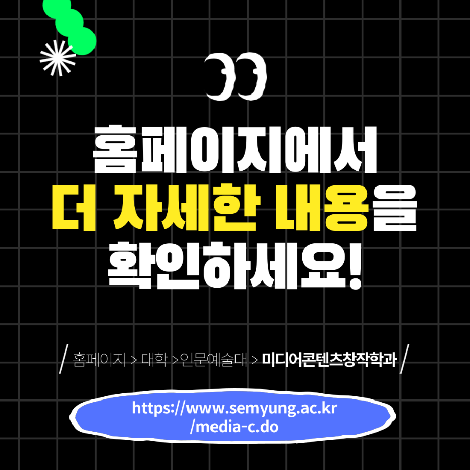 본문 시작 홈으로 MCC News 학과소개 교수소개 학과과정 MCC News MCC SNS 홈페이지가이드 미디어 정보통 학과 및 재학생 교수 및 졸업생 미디어 정보통 미디어 정보통 페이스북 트위터 프린트 미디어콘텐츠창작학과 궁금해?! 미디어콘텐츠창작학과 848 2025-07-21 🎥미디어콘텐츠창작학과❗️궁금해❓📖 영상부터 출판, 그래픽, 소설까지! 내 아이디어를 콘텐츠로 만드는 곳. 창작의 모든 과정을 직접 경험하고, 나만의 이야기를 세상에 전하세요✨ 자세한 내용은 미콘창 인스타그램에서 확인하세요 @smu_mcc 목록 이전여름방학 갈만한 여행지 추천.zip 다음 2025 시청자미디어대상 방송영상공모전 담당부서 : 미디어콘텐츠창작학과 담당자 : - 연락처 : 043-649-1741 최종수정일 : 2024-10-26 만족도조사 만족도 조사 이 페이지에서 제공하는 정보에 대하여 만족하시나요? 매우만족 만족 보통 불만족 매우불만족