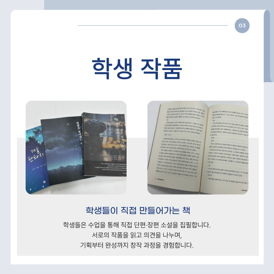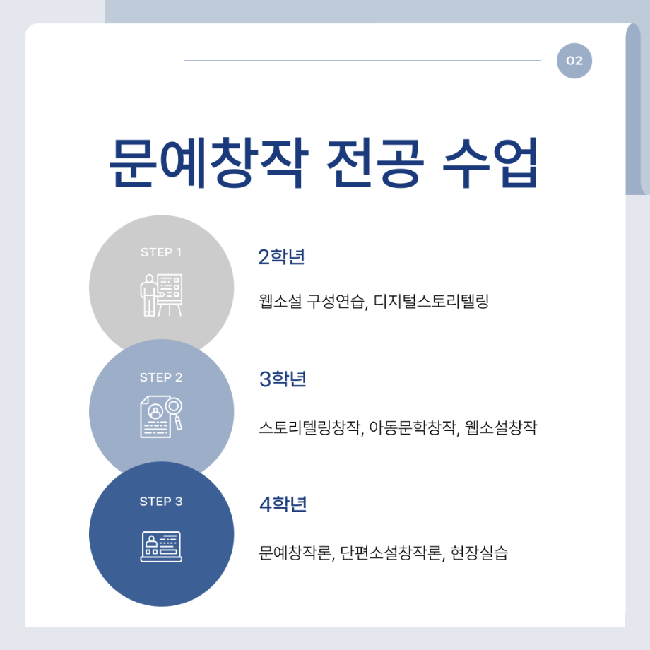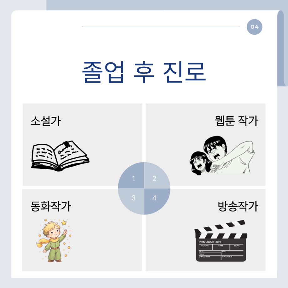 본문 시작 홈으로 MCC News 학과소개 교수소개 학과과정 MCC News MCC SNS 홈페이지가이드 미디어 정보통 학과 및 재학생 교수 및 졸업생 미디어 정보통 미디어 정보통 페이스북 트위터 프린트 📖 미디어콘텐츠창작학과 | 소설 전공 미디어콘텐츠창작학과 797 2025-08-25 한 문장에 담긴 상상, 한 이야기로 완성되는 세계. 소설 전공에서는 기초 글쓰기부터 장르소설, 장편 창작까지 글쓰기의 전 과정을 배우며 실력을 쌓아갑니다. 작품 집필, 합평 수업, 출판 연계 활동을 통해 스토리텔링 능력과 창작 역량을 키우고, 작가·출판 기획자·콘텐츠 스토리텔러 등 다양한 진로로 나아갈 수 있습니다. 목록 이전📖미디어콘텐츠창작학과 | 출판 전공 다음 백억커피 x 곰믹스 AI 활용 영상 공모전 담당부서 : 미디어콘텐츠창작학과 담당자 : - 연락처 : 043-649-1741 최종수정일 : 2024-10-26 만족도조사 만족도 조사 이 페이지에서 제공하는 정보에 대하여 만족하시나요? 매우만족 만족 보통 불만족 매우불만족