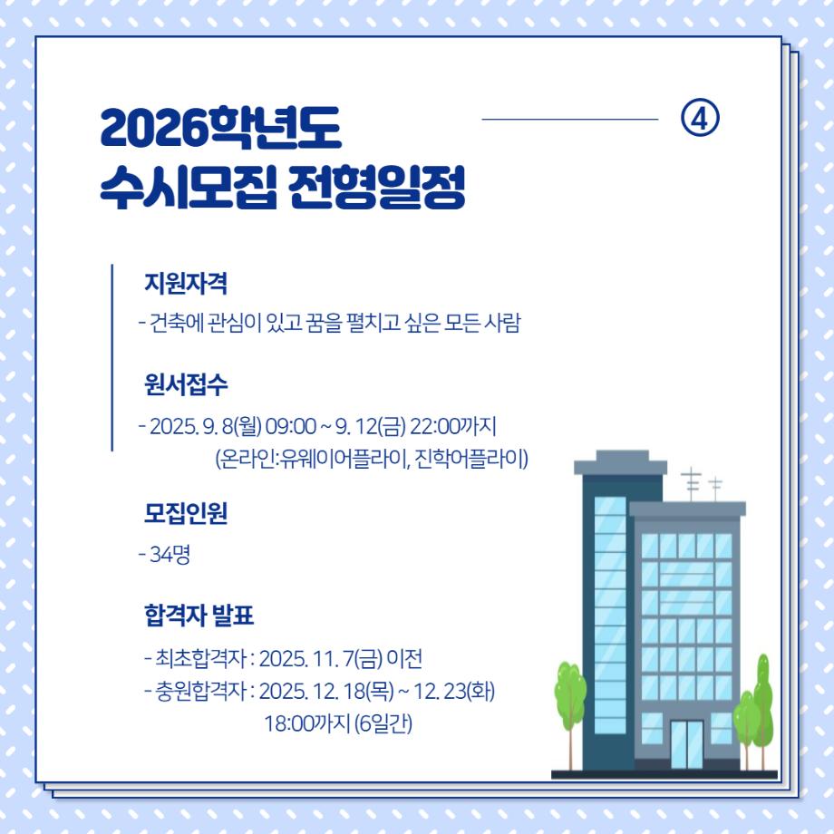 본문 시작 홈으로 커뮤니티 학과소개 교수소개 교육과정 학과 행사 및 활동 커뮤니티 홈페이지가이드 열린정보 학과일정 학과공지 채용정보 및 자료 열린정보 포토갤러리 먹거리, 즐길거리 포토갤러리 사진 사진 영상 사진 페이스북 트위터 프린트 사진 영상 2026학년도 수시모집 - 건축학과 건축학과 620 2025-08-12 목록 이전2025 지역연계 창의융합 캠프 운영 다음 2026 수시주요사항 및 전년도 입시결과 만족도조사 만족도 조사 이 페이지에서 제공하는 정보에 대하여 만족하시나요? 매우만족 만족 보통 불만족 매우불만족
