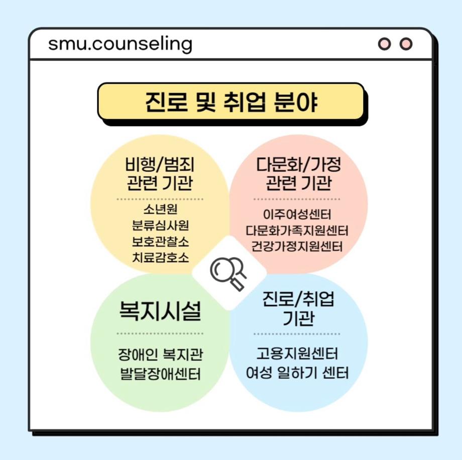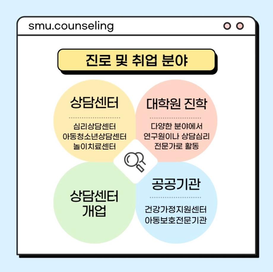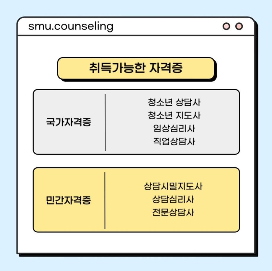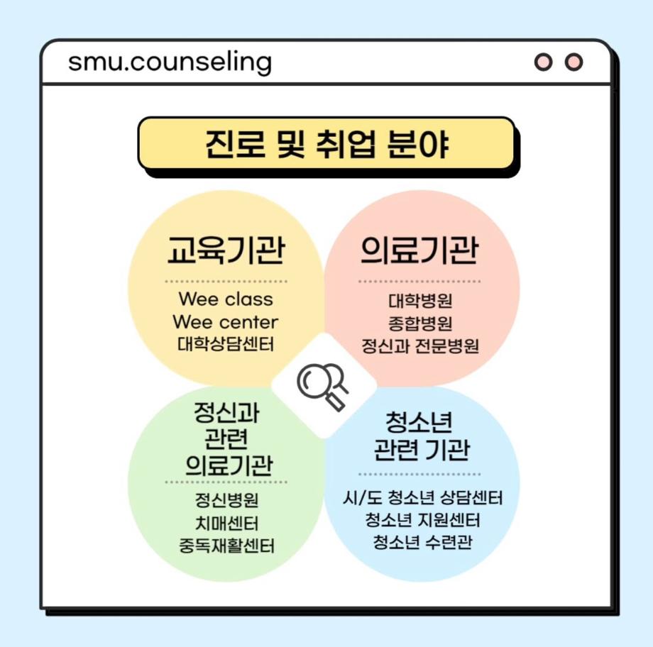 본문 시작 홈으로 학과 커뮤니티 학부소개 교수소개 교육목표 입학안내 학과 커뮤니티 대학원 커뮤니티 홈페이지가이드 학과 갤러리 학과소식 학사일정 학과 갤러리 학과 갤러리 페이스북 트위터 프린트 자격증&진로 소개 상담심리학과 536 2025-07-30 안녕하십니까 세명대학교 상담심리학과입니다! 오늘은 상담사가 되기 위해 필요한 자격증, 취업 분야를 소개해드리려고 합니다. 상담심리학과 졸업 후에는 교육기관, 의료기관, 복지시설 등 다양한 분야에서 활동할 수 있습니다 :) 목록 이전[현직자 인터뷰] 평창군청소년상담복지센터 다음 [현직자 인터뷰] 육군 상담사 만족도조사 만족도 조사 이 페이지에서 제공하는 정보에 대하여 만족하시나요? 매우만족 만족 보통 불만족 매우불만족
