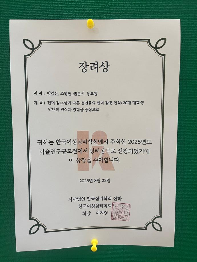 지난 8월 한국심리학회 연차학술대회 심리분과(여성) 공모전에서
